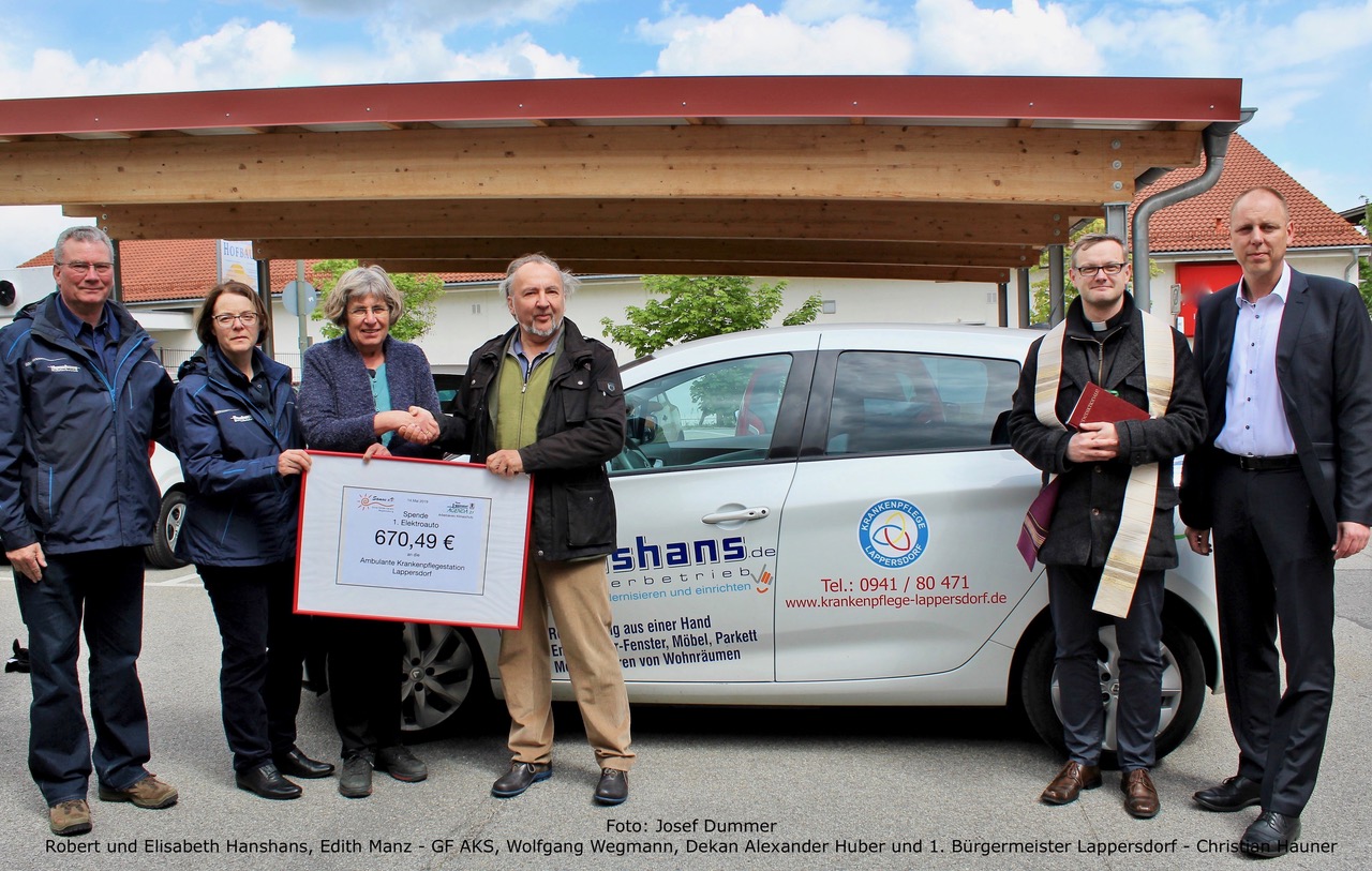 Die Ambulante Krankenpflegestation Lappersdorf (AKS) hat nun das erste Elektrofahrzeug in Diensten genommen. Zusammen mit der AGENDA21 Lappersdorf wurde auf Veranstaltungen und Vorträgen dafür gesammelt. Der stattliche Betrag von 670 € kamen dabei ehrenamtlich zusammen. Der finale Anstoß dazu war nun von der Schreinerei Hanshans, ihre gebrauchte ZOE kostengünstig an die AKS zu übergeben. Die Werbung der Firma Hanshans auf dem Fahrzeug bleibt. Dafür spenden die Firmeninhaber Elisabeth und Robert Hanshans nun zusätzlich jährlich 250 Euro.