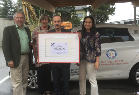 Am 7.8. nahm Frau Edit Manz, Geschäftsführerin der Ambulanten Krankenpflegestation Lappersdorf (AKS) von Frau Dr. Cosima Rücker, 1. Vorsitzende vom Zahnärztlichen Bezirksverband Oberpfalz (ZBO) eine Spende von 750 € für das Erste Elektro-Fahrzeug im Fuhrpark der Krankenpflegestation entgegen. Anlässlich des 33. Oberpfälzer Zahnärztetages kam dieser Betrag im Rahmen eines Festvortrages zur Elektromobilität von Wolfgang Wegmann, Vorstand Samos e.V., zustande. Das Fahrzeug ist bereits seit einigen Wochen in den Händen der Pflegekräfte und wird am Standort geladen. Für die Pflegerinnen ist das E-Auto bestens geeignet. Keine Kaltstarts, keine Abgase und zuverlässig in den Morgenstunden unterwegs zu sein, hat auch den Vorteil entspannter bei den Patienten anzukommen. Nicht nur die Ruhe beim Fahren, auch die agile Beweglichkeit selbst machen Freude, betont Schwester Marion Raffelt, die mit dem Auto dienstlich unterwegs ist.