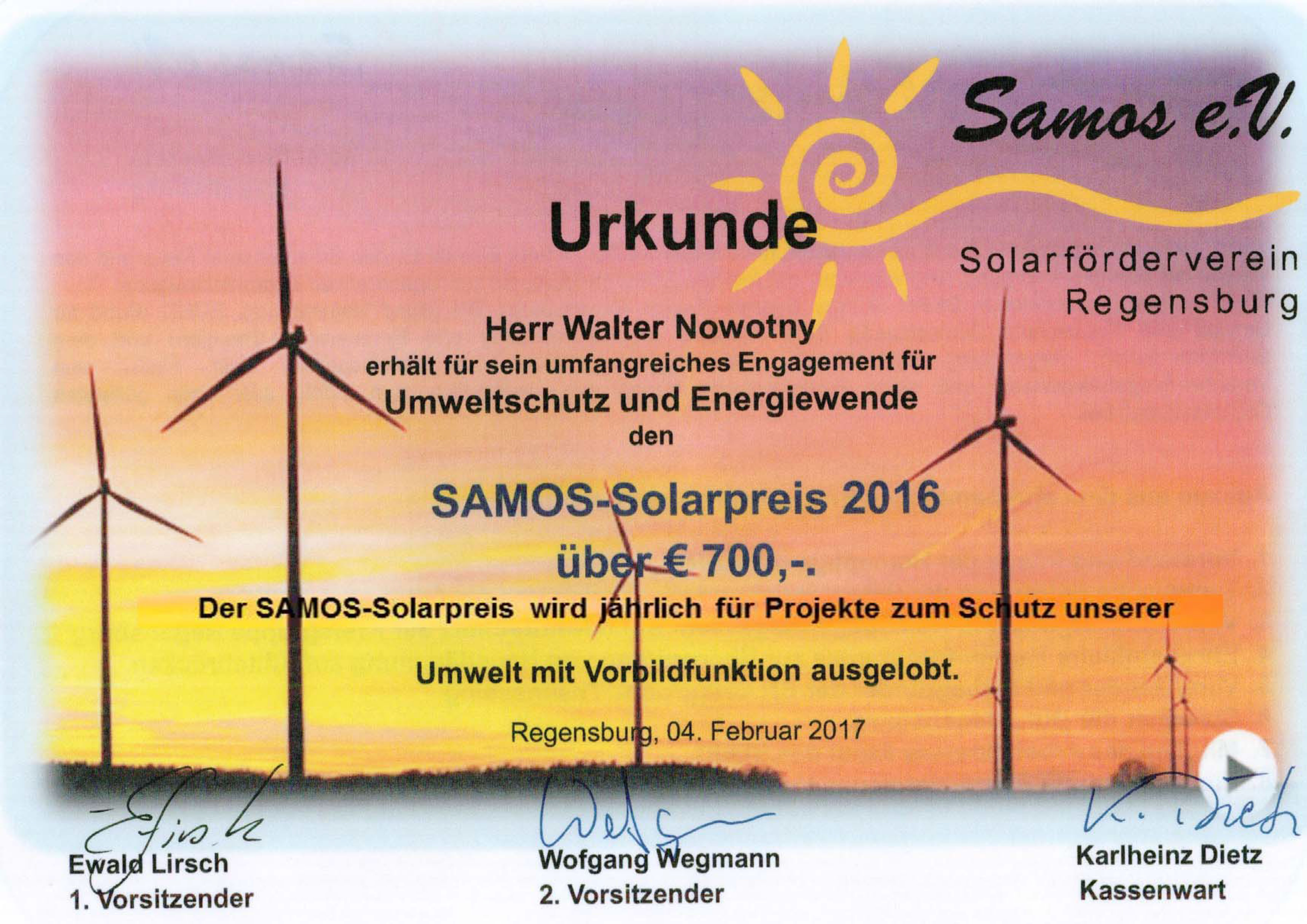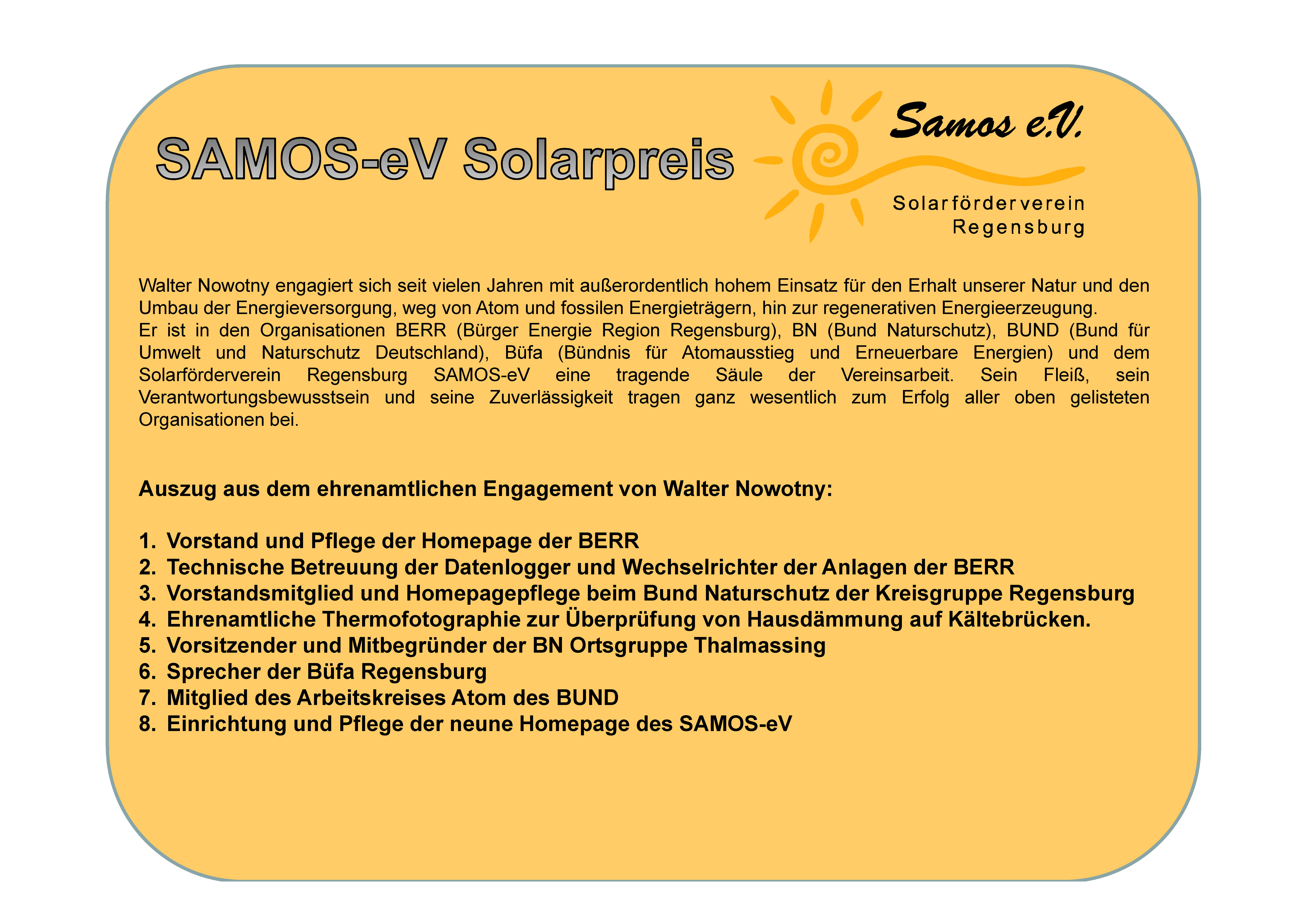 Samos Solarpreis 2016 geht an Walter Nowotny