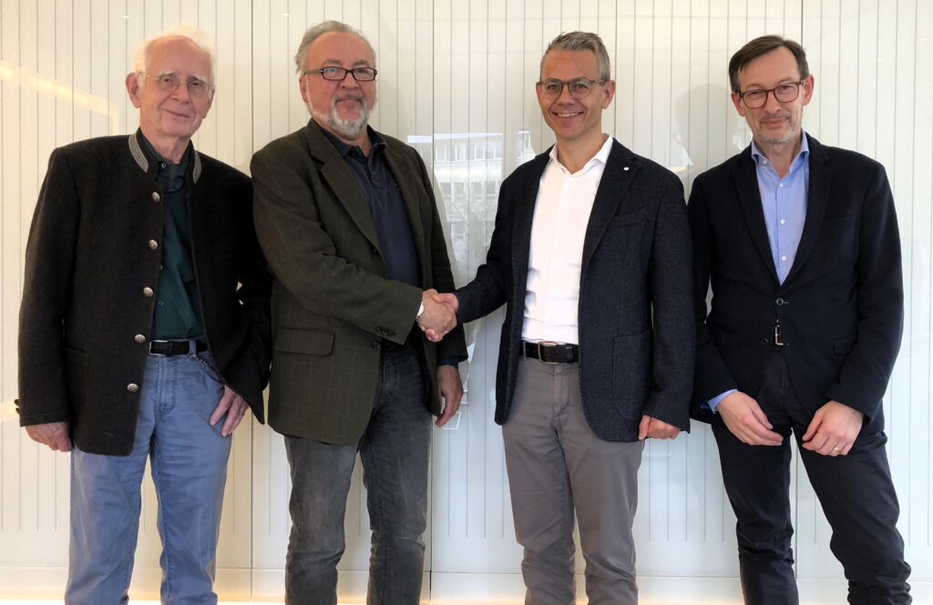 Im Bild v.l.. Dr. Martin Creuzburg, Wolfgang Wegmann gratulieren Martin Gruber Vorstandsvorsitzender, Alexander Scheugenpflug, Leiter unserer Abteilung Organisation, Sparda-Bank Ostbayern.