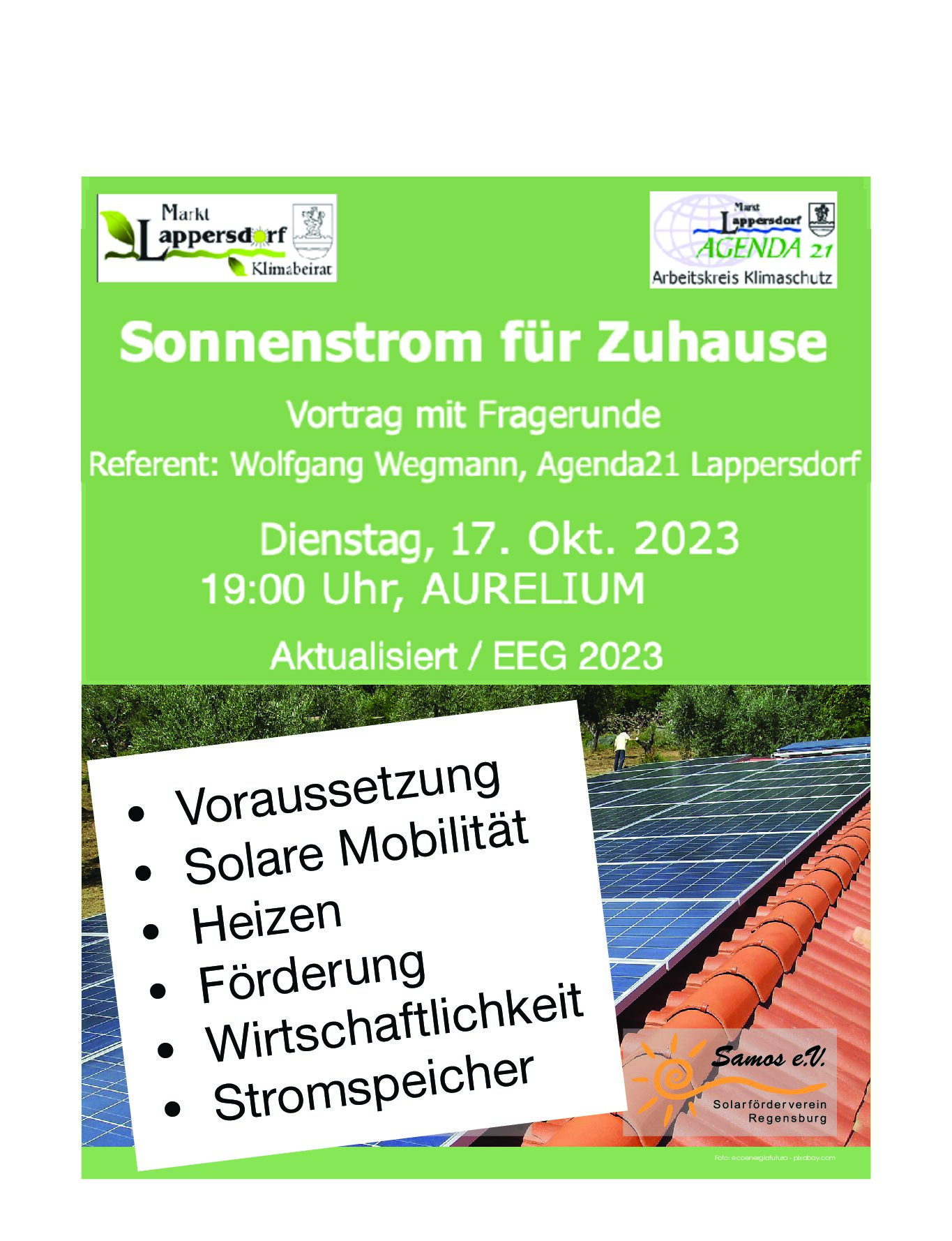 « Alle Veranstaltungen Diese Veranstaltung hat bereits stattgefunden. Sonnenstrom für Zuhause 2.0 Lappersdorf AURELIUM 17. Oktober 2023 - 19:00 - 21:00 Kostenlos « Monatstreffen Oktober Jahreshauptversammlung mit Wahlen » EINLADUNG : Im Vortrag und den ausgedehnten Fragerunden geht es Rund um das Errichten und dem Betrieb von Solarstromanlagen auf Privatgebäuden. Es sind keine technischen Grundkenntnisse erforderlich. Zum Kalender hinzufügen Google Kalender iCalendar Outlook 365 Outlook Live Details Datum: 17. Oktober 2023 Zeit: 19:00 - 21:00 Eintritt: Kostenlos Veranstaltungskategorie: Infoabend Veranstaltung-Tags:100% Erneuerbar, E-Mobil, eAuto, EEG 2023, Elektromobilität, Emobilität, Energiewende, Erfahrung mit PV-Anlage, Erneuerbare Energien, Photovoltaik, Regensburg, Solare eMobilität, Solarenergie, Solarstrom, Solarwärme, steckerfertige Photovoltaik Webseite: samos-ev.de Veranstalter Agenda21 Lappersdorf & Samos e.V. Telefon 0941891512 E-Mail info@SAMOS-ev.de Veranstaltungsort AURELIUM, Am Anger 1, 93138 Lappersdorf, Regensburg http://aurelium.de/ Am Anger 1 Lappersdorf, 93138 Deutschland Google Karte anzeigen Add a Comment Antworten abbrechenDu musst angemeldet sein, um einen Kommentar abzugeben. Add a Comment Antworten abbrechenDu musst angemeldet sein, um einen Kommentar abzugeben.